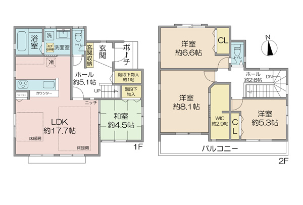 ■京成松戸線「五香」駅徒歩12分 ■2018年1月築 ■東・北 角地 ■土地面積125.28㎡ ■4LDK+WIC ■オール電化 ■約17.7帖のLDK ■キッチンは食洗機付 IHクッキングヒーター ■浴室はゆったり1616サイズ 浴室換気乾燥機付 ■駐車スペース2台分(車種による)