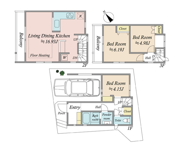 内装リフォーム実施 〜2026年3月完成〜・キッチン(浄水器付き水栓)・洗面室(洗面化粧台、洗濯用水栓)・トイレ(温水洗浄便座一体型便器 2階・3階)・照明器具、スイッチコンセント、建具交換・フローリング上貼(LDK、洋室全室、廊下)・フロアタイル貼(洗面室、トイレ)・壁・天井:クロス貼 など■各居室6帖以上のゆとりある間取り■作業台が広く調理がしやすいL字型キッチン■全室2面採光のため通風良好■トイレ2か所あり■駐車スペース1台分あり(車種制限あり)