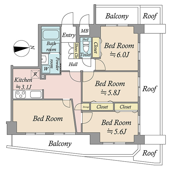 2015年7月築 7階最上階角住戸につき、陽当たり通風良好!専有面積:68.72㎡の4DK、16.31㎡東向きバルコニー