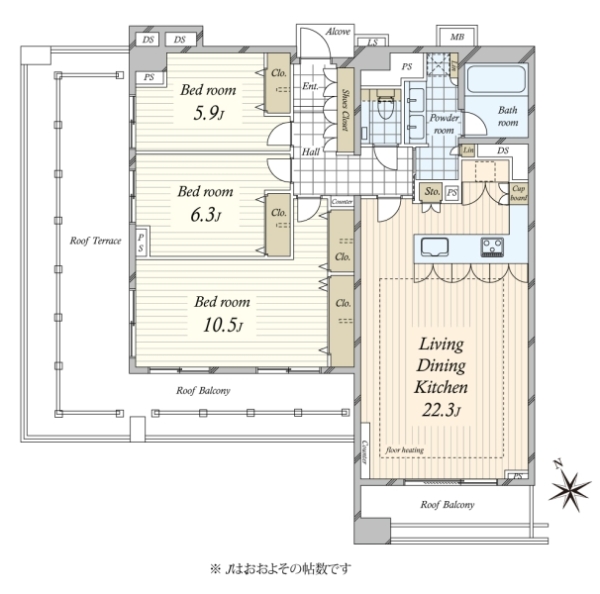 ・ワイドスパンのバルコニーからセンターガーデンを見下ろす眺望・木彫の柔らかさと重厚感ある玄関・ハンズフリーキーシステム対応・タイル仕様のリビングダイニング・開放的なオープンキッチン採用、ディスポーザー・(Miele社製)IHクッキングヒーター、食器洗浄機、電子コンベック・利便性の良いバトラースペース・専有面積/109.72平米(約33.19坪)、トランクルーム面積/0.7平米(約0.21坪)含む