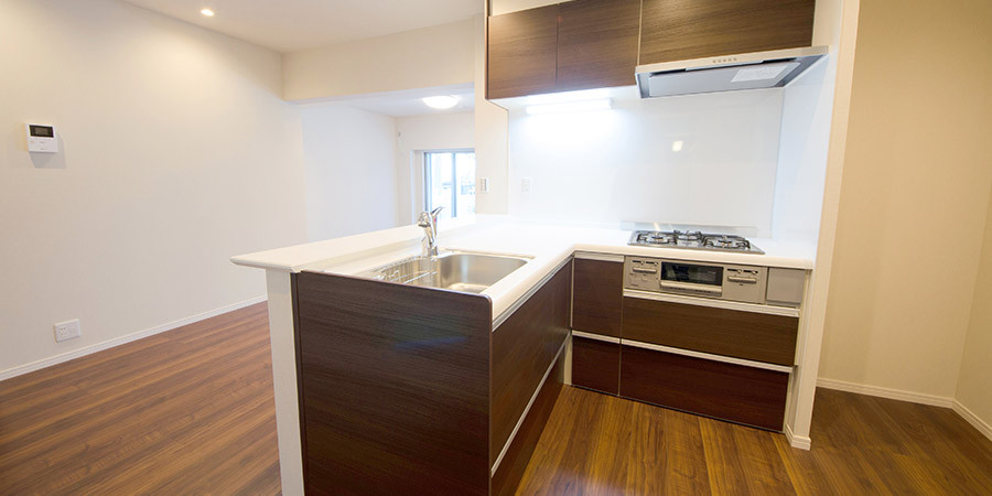 使いやすいオリジナルレイアウトに変更。キッチンは落ち着いた色合いで都会的に